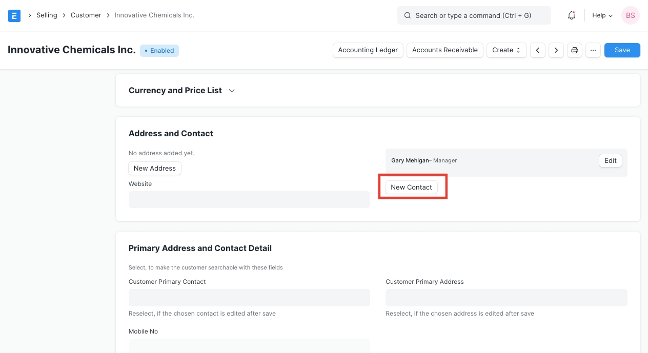 Bạn cũng có thể thêm một Liên hệ từ bản ghi Khách hàng hoặc Nhà cung cấp bằng cách nhấp vào nút “Liên hệ mới” như hình bên dưới.