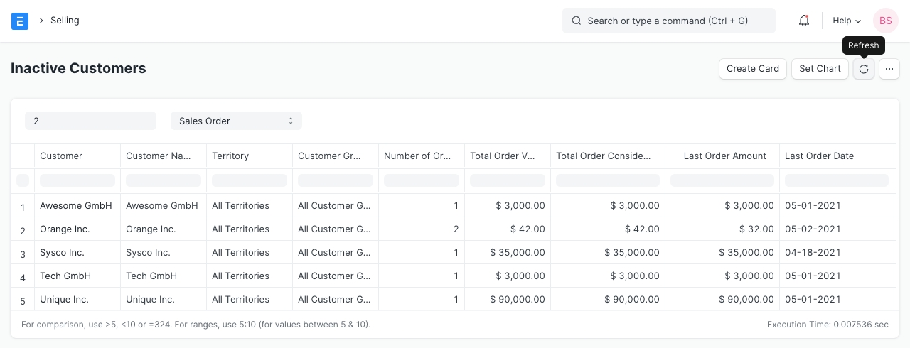 Báo cáo này hiển thị danh sách khách hàng đã không mua hàng kể từ số ngày cụ thể. Bạn có thể đề cập đến số ngày trong bộ lọc 'Số ngày kể từ lần đặt hàng cuối cùng'. Ngoài ra, bạn có thể đề cập xem Đơn đặt hàng hoặc Hóa đơn bán hàng có được xem xét trong bộ lọc DocType hay không.