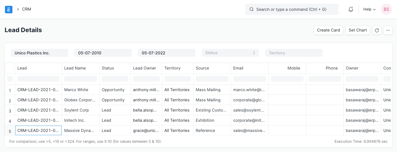Báo cáo này cung cấp tên khách hàng tiềm năng, địa chỉ, chi tiết liên hệ, nguồn khách hàng tiềm năng, lãnh thổ và các chi tiết khác.