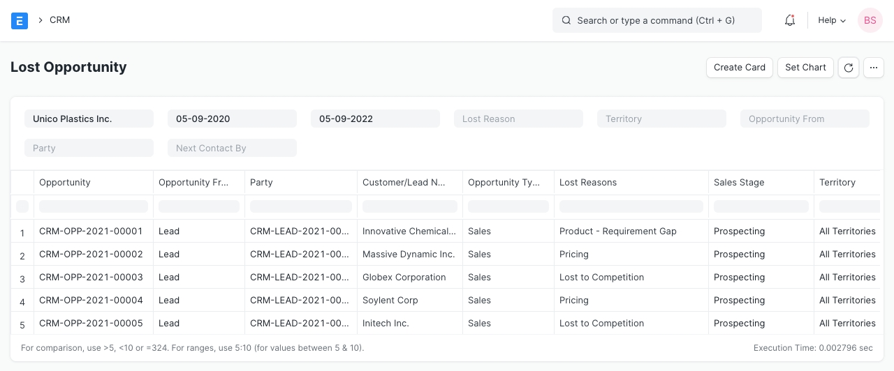Báo cáo này cung cấp các chi tiết Cơ hội bị mất như cơ hội từ, bên, tên khách hàng, lý do bị mất, giai đoạn bán hàng, lãnh thổ và các chi tiết khác.