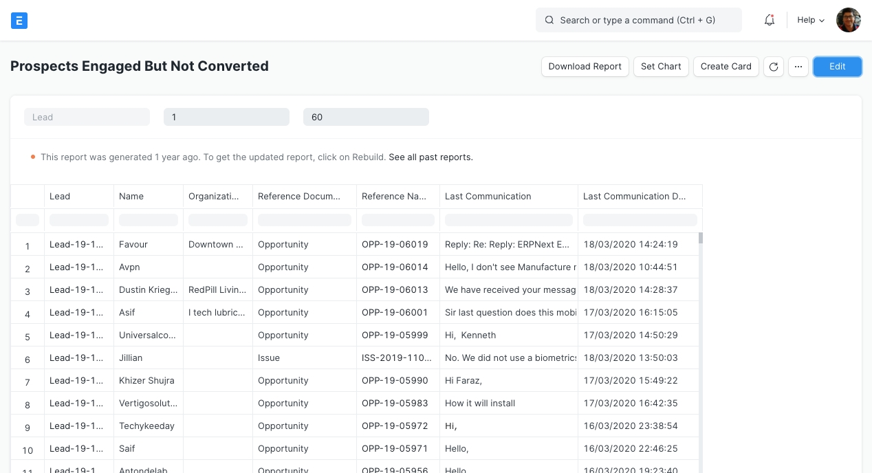 Tính năng báo cáo của mô-đun CRM giúp người dùng có được thông tin về khách hàng tiềm năng. Sử dụng các báo cáo sau đây, người dùng ERPNext có thể phân tích dữ liệu về lịch sử của khách hàng tiềm năng với một công ty và sẽ giúp người dùng xây dựng mối quan hệ bền chặt với khách hàng tiềm năng. Đây là tập hợp các báo cáo trong CRM > Báo cáo .
