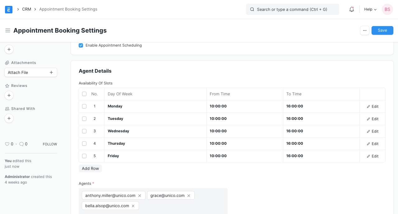 Tại đây, bạn có thể đặt thời gian mà các đại lý của bạn sẵn sàng tham dự một cuộc hẹn. Điều này được thiết lập mỗi ngày trong tuần. Mỗi hàng đại diện cho một khối thời gian liên tục, bạn có thể có nhiều mục cho mỗi ngày trong tuần.