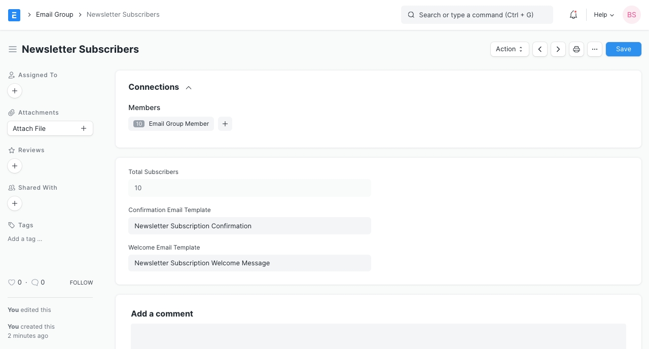 Bạn có thể chỉ định email xác nhận và mẫu email chào mừng cho nhóm email. Một email xác nhận sẽ được gửi để xác nhận việc một người đăng ký nhận bản tin của bạn. Email chào mừng được gửi khi người đó xác nhận đăng ký nhận bản tin email của bạn.
