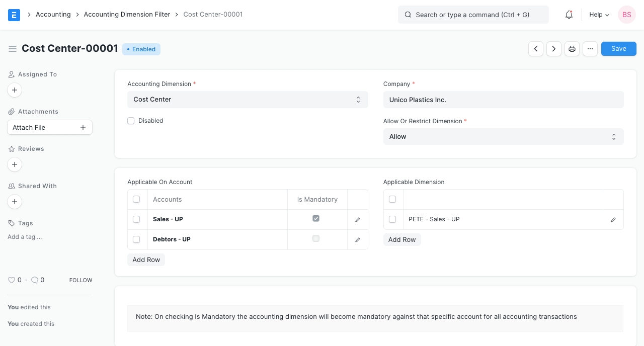 Trong ERPNext, bạn có thể kiểm soát việc gắn thẻ các thứ nguyên kế toán khác nhau đối với một tài khoản cụ thể. Bạn có thể cho phép hoặc hạn chế các thứ nguyên kế toán nhất định đối với tài khoản bằng cách sử dụng các bộ lọc thứ nguyên kế toán