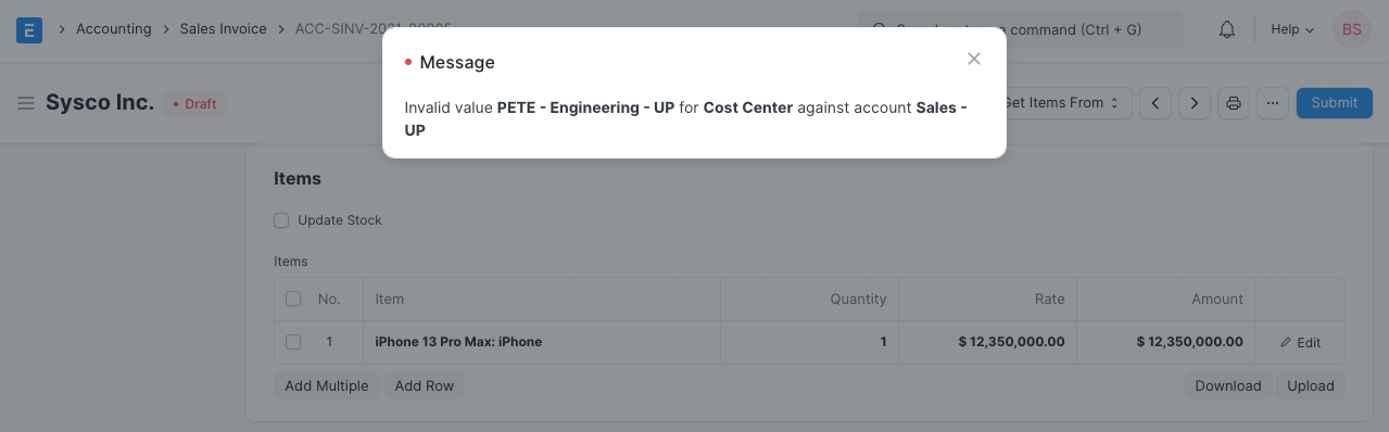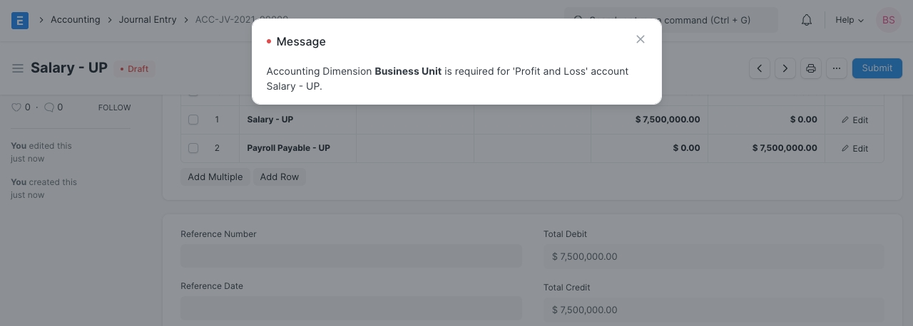 Trong trường hợp bất kỳ thứ nguyên bắt buộc nào bị thiếu hoặc thứ nguyên bị hạn chế được gắn thẻ đối với bất kỳ tài khoản hiện hành nào, hệ thống sẽ không cho phép gửi giao dịch đó cho đến khi thứ nguyên kế toán chính xác được chọn.
