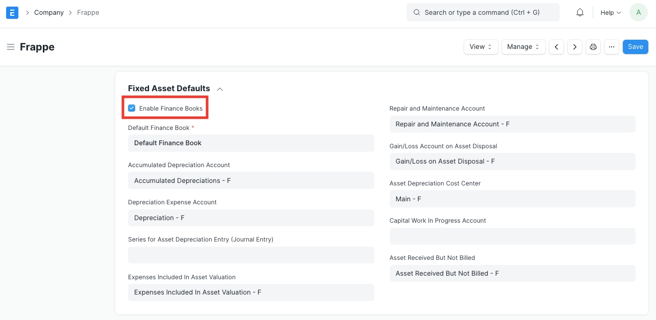 Để sử dụng Sổ Tài chính, bạn cần kiểm tra Bật Sổ Tài chính trong phần Mặc định Tài sản Cố định của Công ty tổng thể.