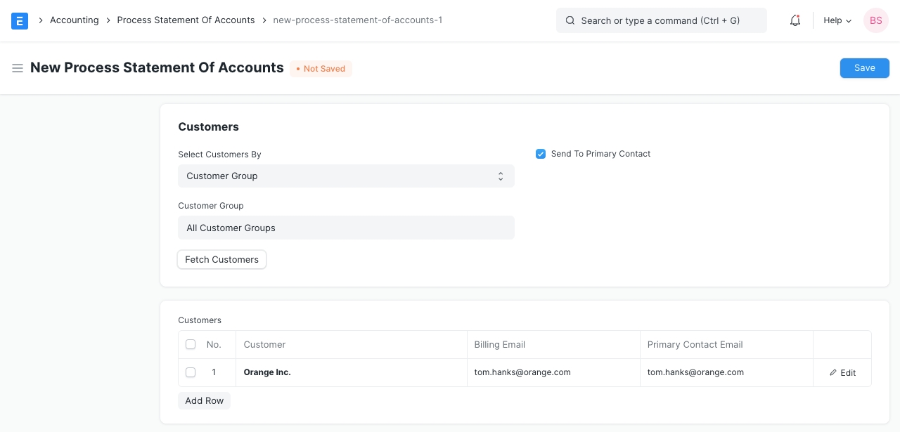 Báo cáo quy trình mới của tài khoản Trong phần "Khách hàng", bạn có tùy chọn để chọn khách hàng trong bảng con và tìm nạp email chính và email thanh toán của họ.