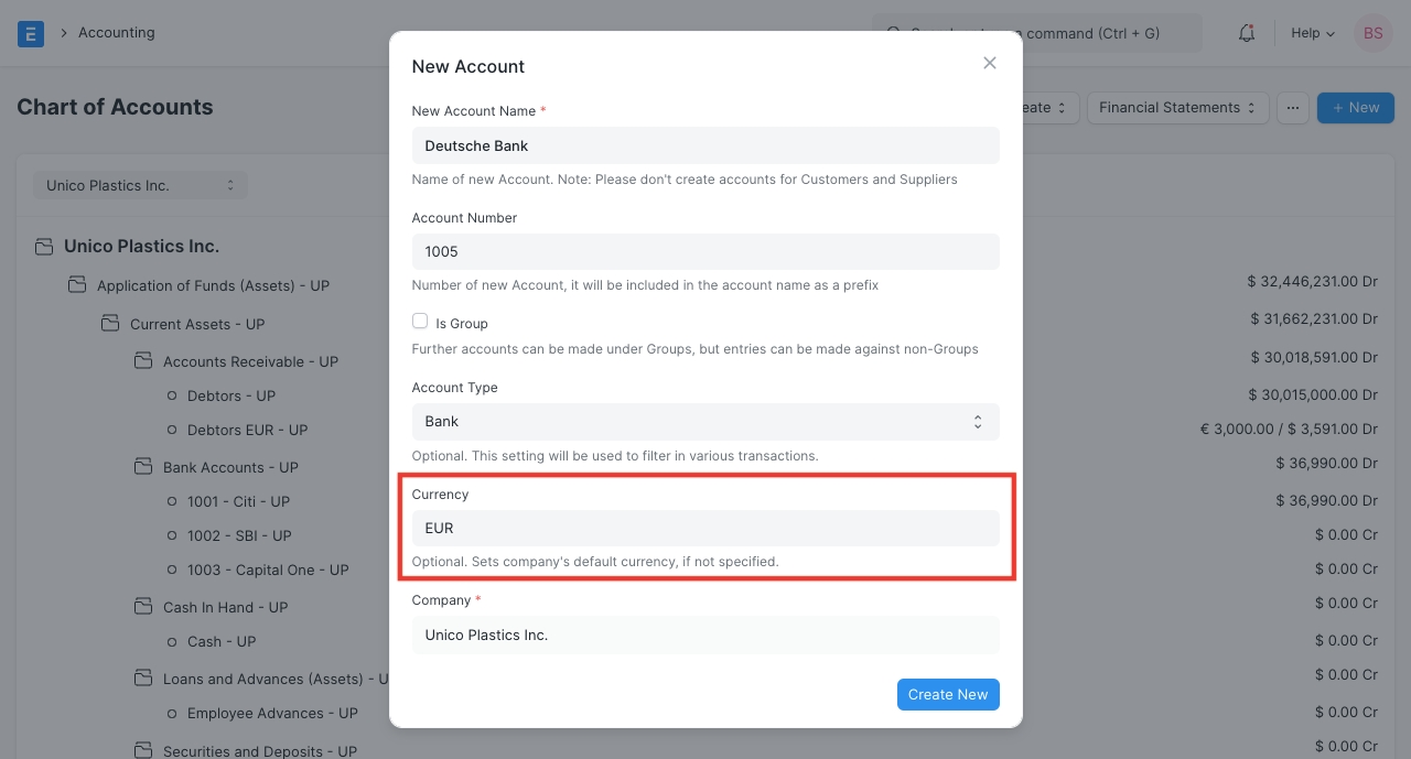 Bạn có thể xác định Đơn vị tiền tệ từ Biểu đồ Tài khoản trong khi tạo tài khoản.