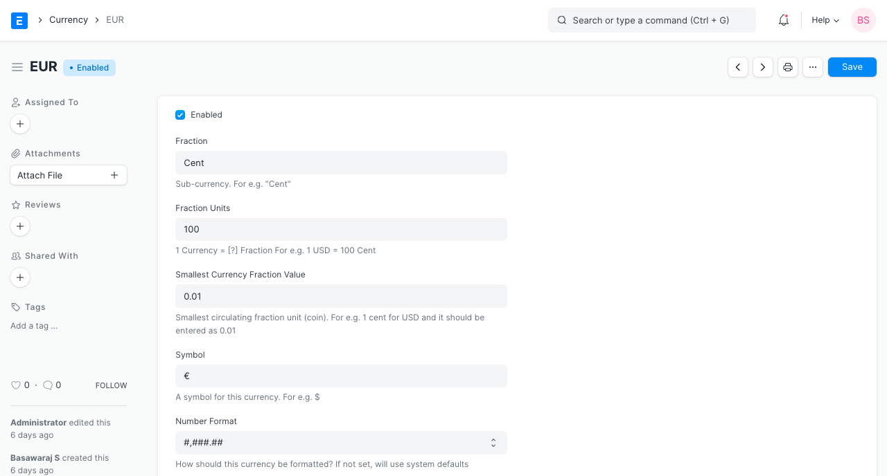 Trong ERPNext, danh sách Tiền tệ lưu trữ giá trị tiền tệ, đó là ký hiệu và đơn vị phân số. Hầu hết các loại tiền tệ thường được sử dụng đều đã có mặt trong ERPNext. Tỷ giá hối đoái được tìm nạp tự động theo tỷ giá thị trường hiện tại. Bạn cũng có thể định cấu hình hệ thống để sử dụng tỷ giá hối đoái cố định cũ hơn bằng cách tạo chúng trong biểu mẫu Tỷ giá hối đoái .