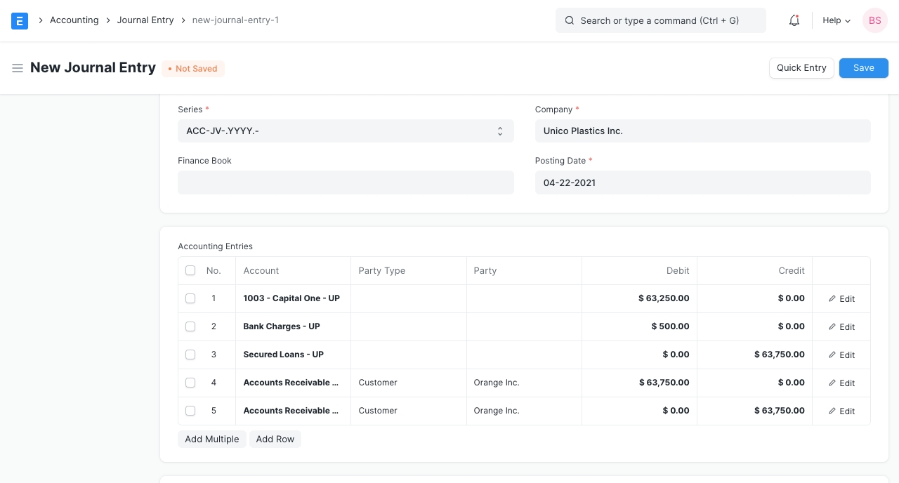 Giải ngân Khoản vay trong Hóa đơn Chiết khấu Bạn sẽ được đưa đến màn hình Nhập nhật ký . Lưu và Gửi Mục nhập Nhật ký.