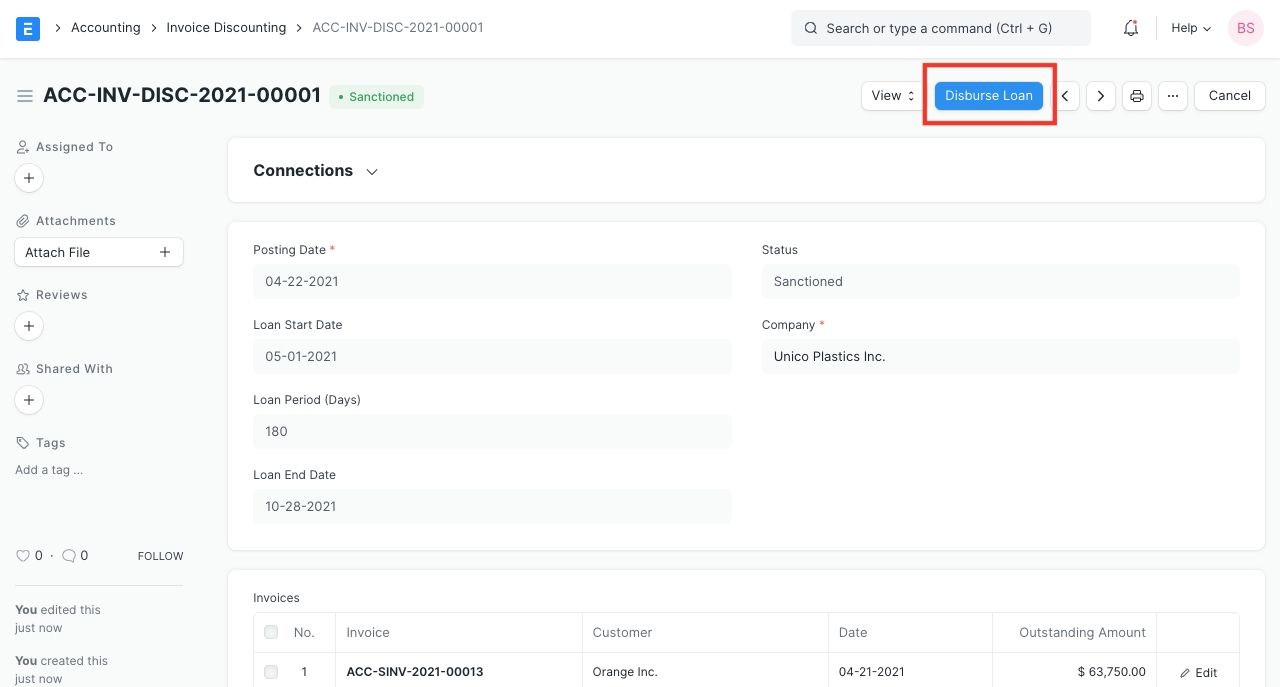 Sau khi gửi biểu mẫu Chiết khấu Hóa đơn, hãy nhấp vào Khoản vay Giải ngân .