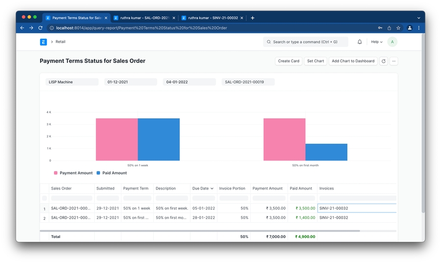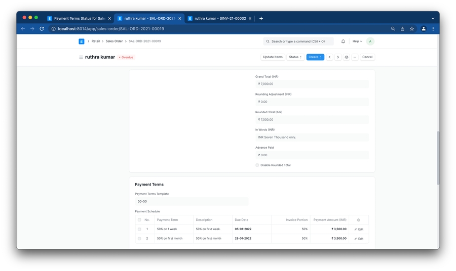 Hãy xem xét Đơn đặt hàng có tổng giá trị là 7000 ₹ và điều khoản thanh toán là 50-50.