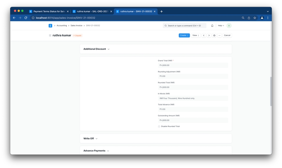 Nếu một Hóa đơn bán hàng được lập theo SO đó với giá 4900 ₹.