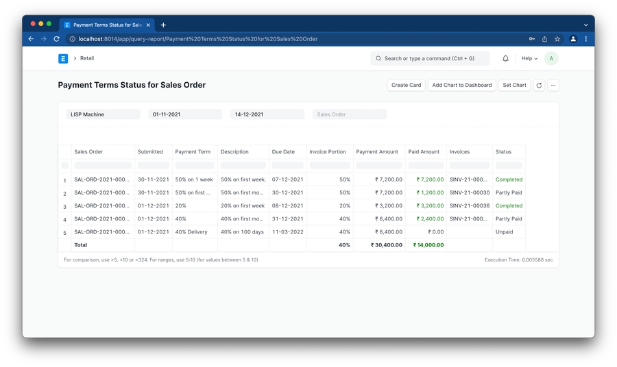 Sau đó, báo cáo sẽ chia số tiền trên hóa đơn thành các điều khoản thanh toán theo phương thức FIFO và hiển thị trạng thái là 'Đã hoàn thành' cho 50% đầu tiên và 'Đã thanh toán một phần' cho 50% thứ hai.