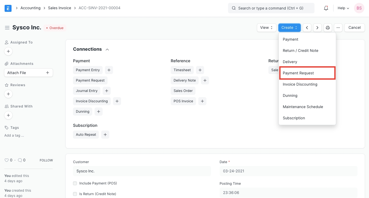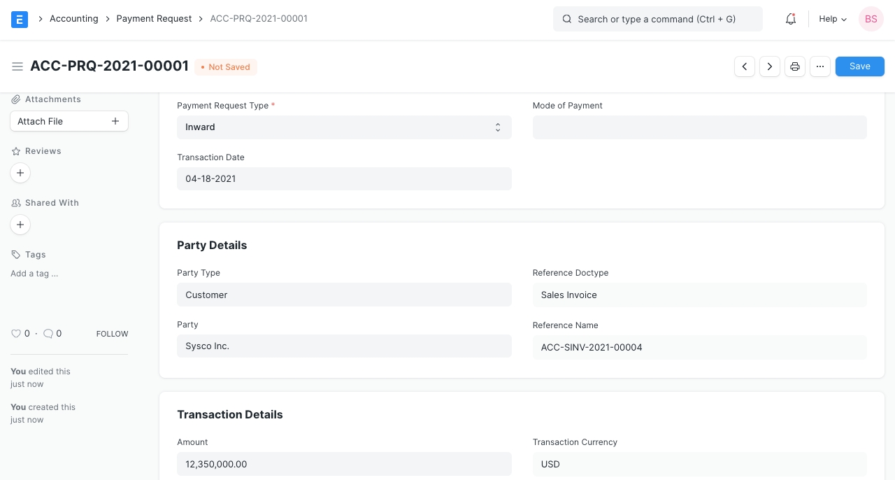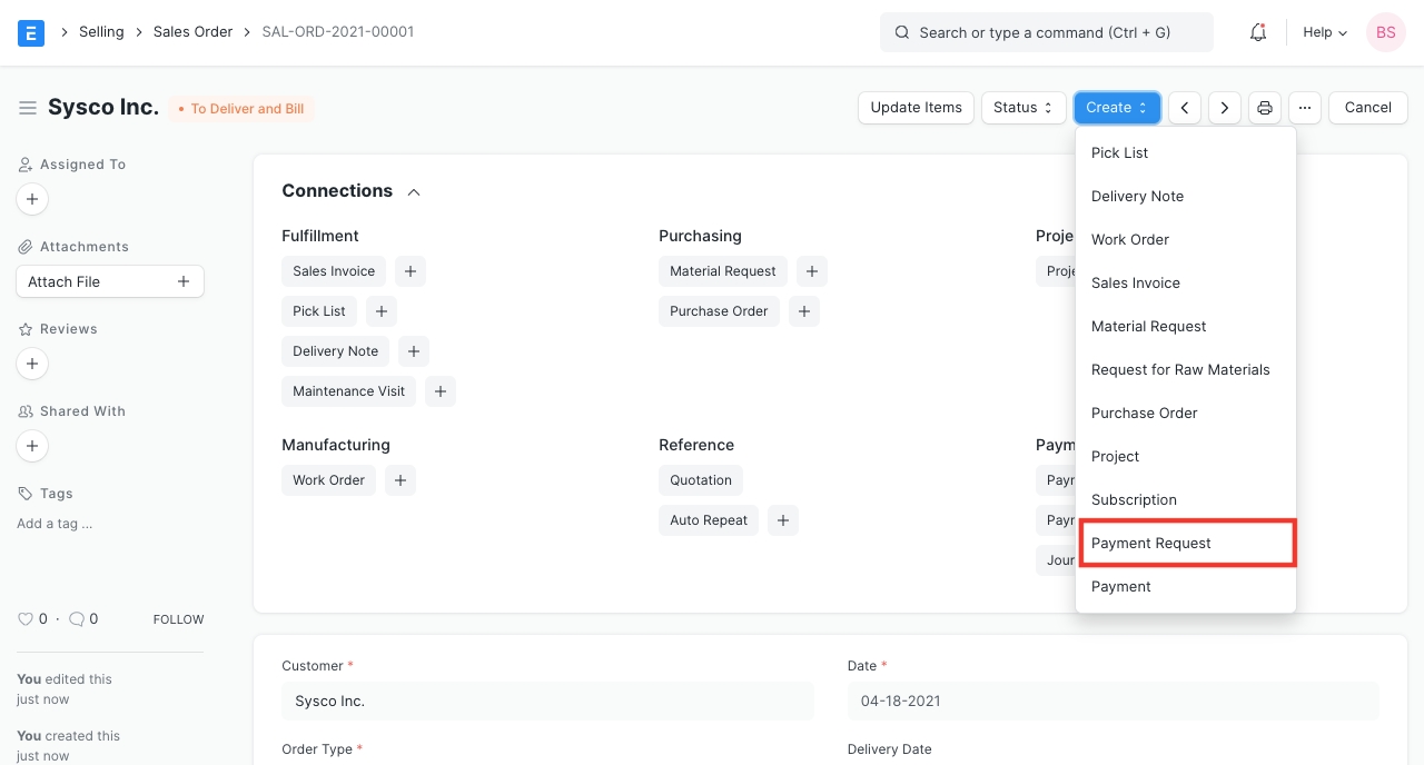Yêu cầu thanh toán không thể được tạo theo cách thủ công, nó được tạo từ Đơn đặt hàng hoặc Hóa đơn bán hàng / Mua hàng.