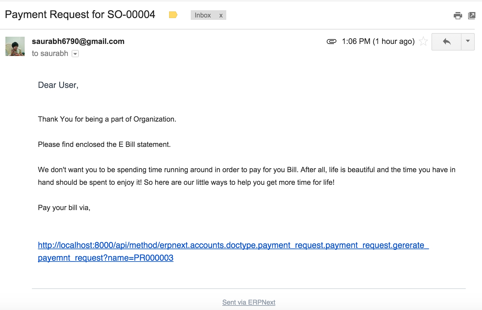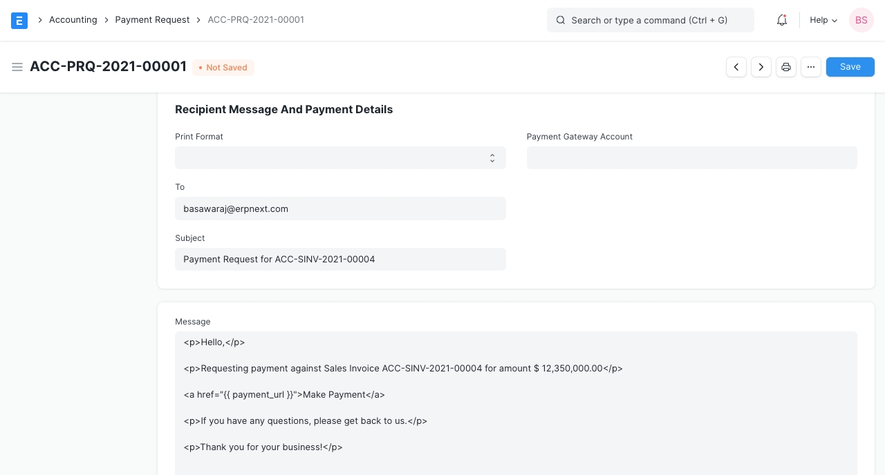 Bạn có thể thông báo cho khách hàng từ Yêu cầu Thanh toán bằng Định dạng In . Nếu email liên hệ của khách hàng được đặt, nó sẽ được tải tự động. Nếu không, bạn có thể đặt địa chỉ email trong Yêu cầu thanh toán.