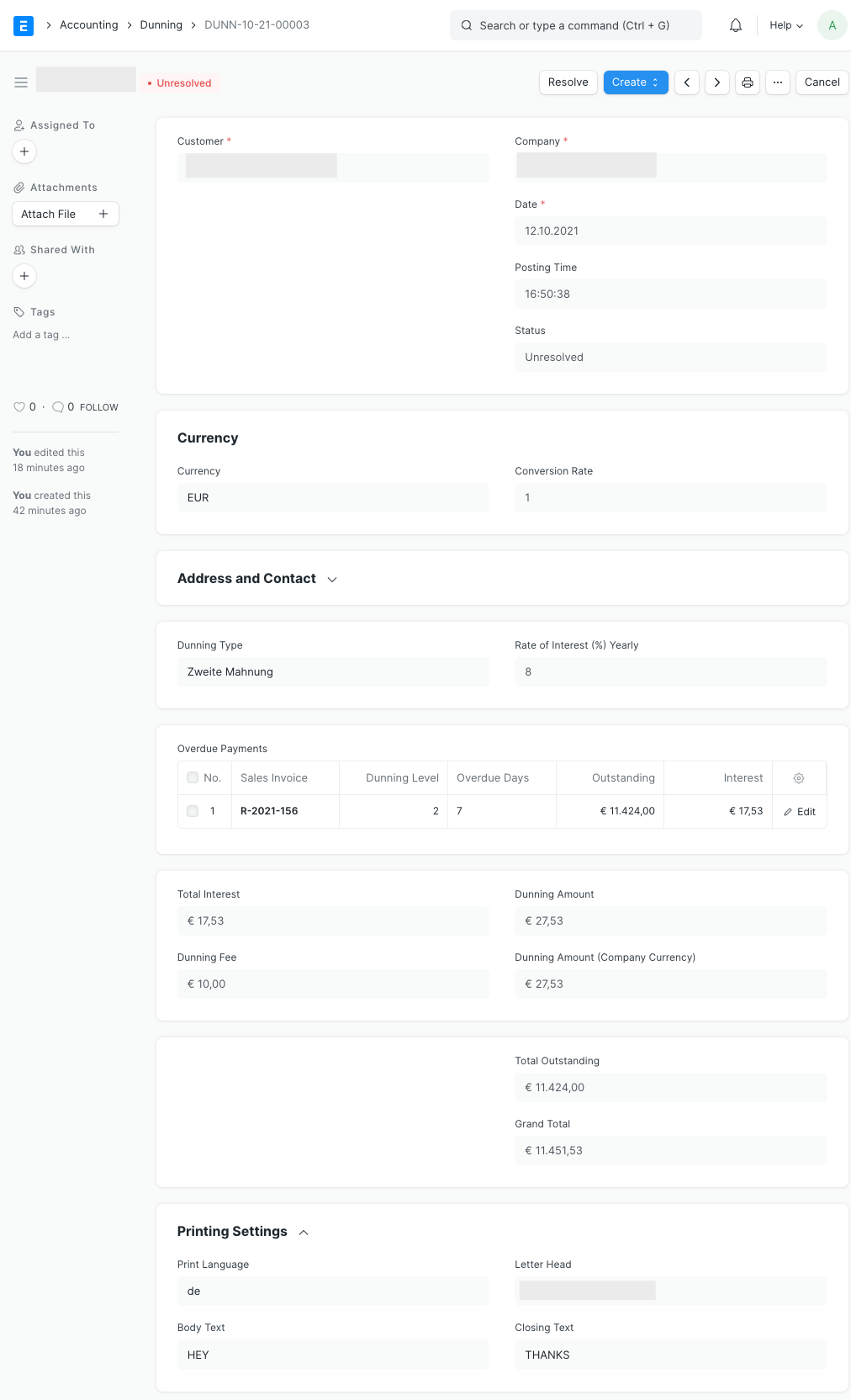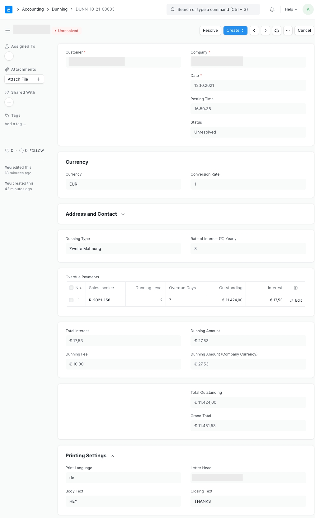 Đã giải quyết : Dunning được giải quyết khi đã nhận được khoản thanh toán chưa thanh toán.