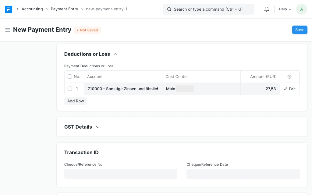 Bạn đã có thể đặt một Tài khoản thu nhập (ví dụ: "Lãi suất khác và thu nhập tương tự") và Trung tâm Chi phí cho thu nhập được tạo ra từ lãi suất và phí lừa đảo. Chúng sẽ được sử dụng khi Mục nhập thanh toán được tạo từ Dunning này .