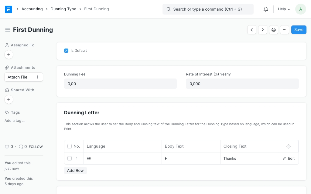 Chọn Loại Dunning để điền lãi suất, phí lừa đảo và khối văn bản với các giá trị được xác định trước. Hoặc bạn cũng có thể đặt các giá trị này theo cách thủ công.