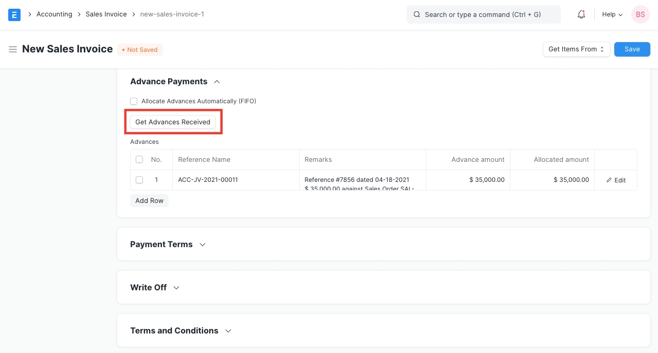 Khi nhấp vào nút Nhận trước Đã nhận , nó sẽ tìm nạp các Mục thanh toán trước được tìm thấy cho bên đó. Khi các Mục nhập Thanh toán Trước được tìm nạp, bạn có thể phân bổ Số tiền tạm ứng cho hóa đơn này. Việc phân bổ sẽ làm giảm Số tiền chưa thanh toán cho hóa đơn đó ngay lập tức.