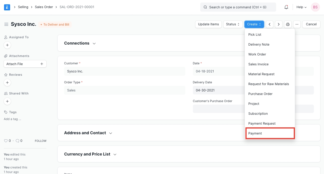 Sau khi một Đơn đặt hàng hoặc Đơn đặt hàng được gửi, bạn sẽ tìm thấy một tùy chọn để tạo Thanh toán cho đơn đặt hàng đó. Bạn cũng có thể tạo Mục nhập thanh toán mới và chọn các giá trị theo cách thủ công (như Bên và tài khoản thanh toán). Dưới đây là các bước để tạo Thanh toán trước đối với Đơn hàng bán hàng.