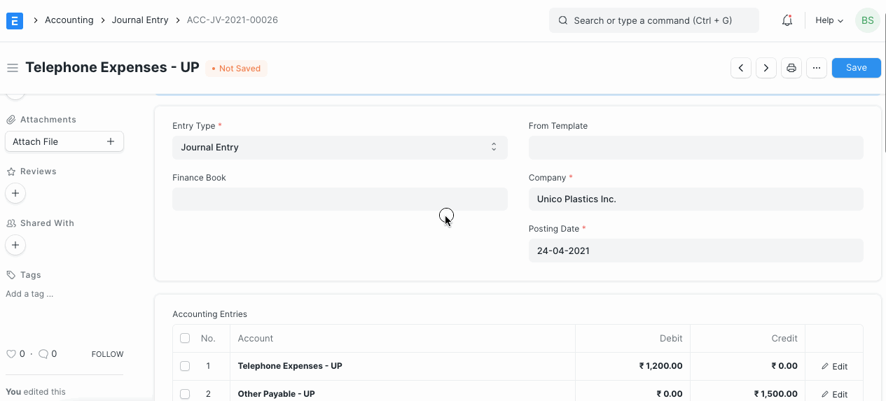 Khi chọn tài khoản dưới hàng mới, ghi nợ và ghi có, mục nhập sẽ được kiểm đếm và bạn sẽ có thể gửi Journal Entri một cách chính xác.