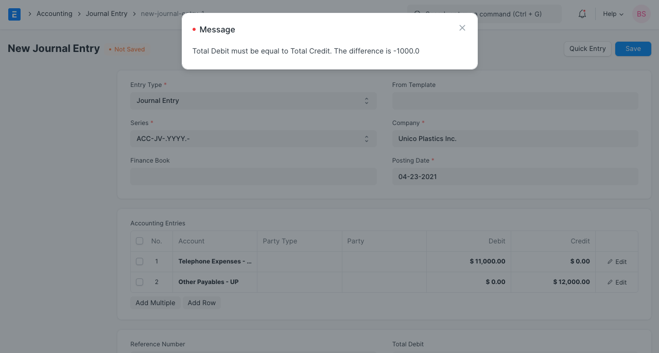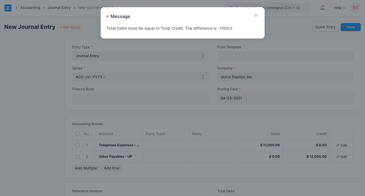 Theo chuẩn mực kế toán, ghi nợ trong bút toán kế toán phải bằng ghi có. Nếu không, hệ thống không cho phép gửi giao dịch kế toán, do đó ngừng đăng sổ cái. Trong ERPNext, khi lưu mục nhập kế toán, hệ thống xác nhận xem ghi nợ và tín dụng có đang kiểm đếm hay không.