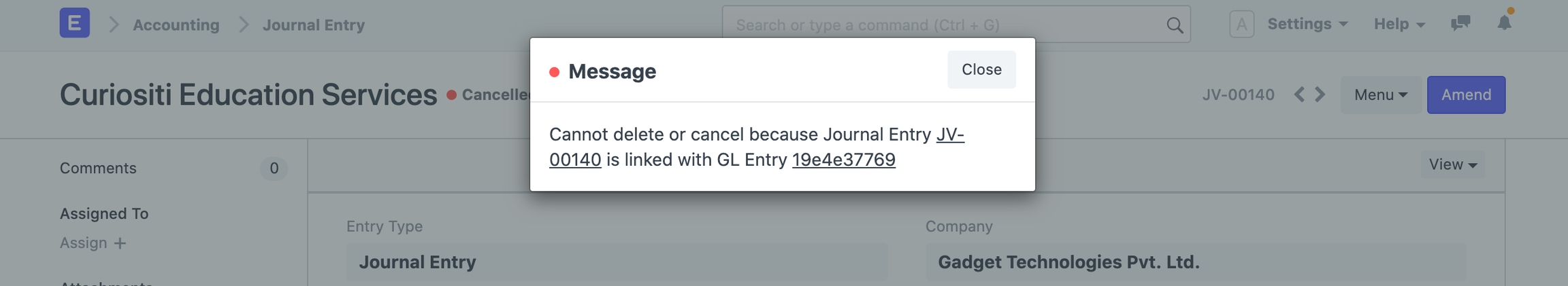 Khi hủy bất kỳ giao dịch nào thay vì xóa Mục nhập GL cho giao dịch đó, các mục nhập ngược lại sẽ được chuyển để hủy bỏ hiệu lực của giao dịch đó vào ngày hủy.
