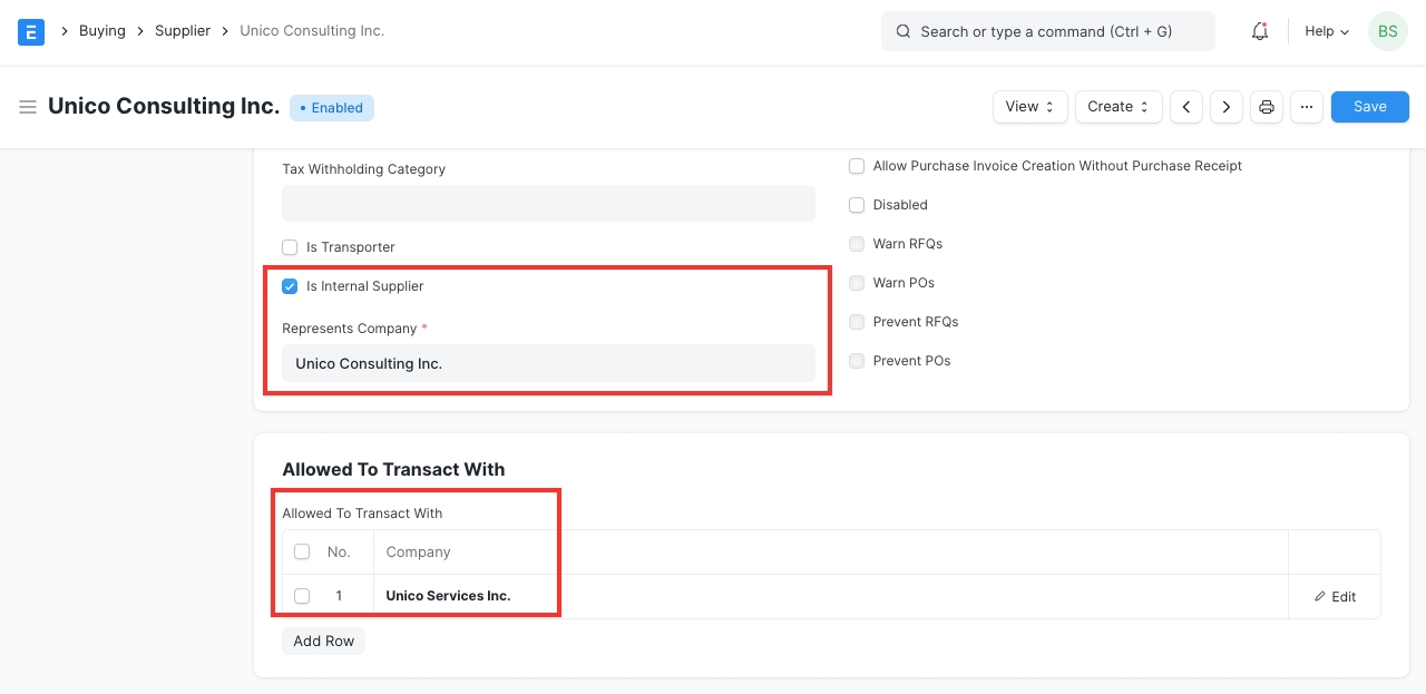 6. Đánh dấu vào Là nhà cung cấp nội bộ.