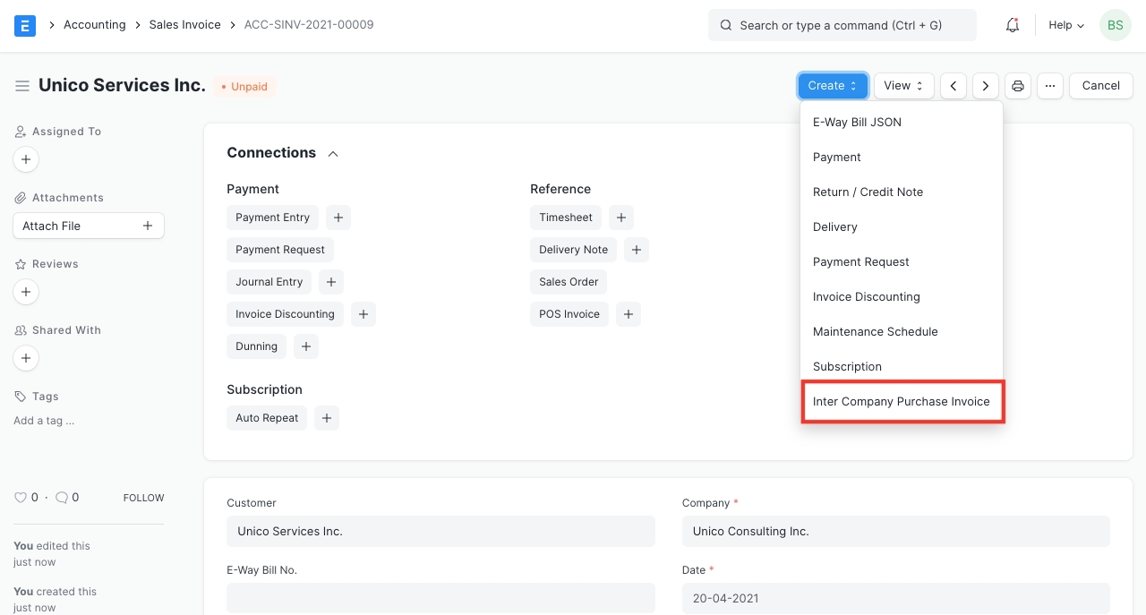 5. Trong menu thả xuống của nút Make , bạn sẽ tìm thấy một liên kết Inter Company Invoice , khi nhấp vào liên kết, bạn sẽ được chuyển đến trang biểu mẫu Mua hàng mới.