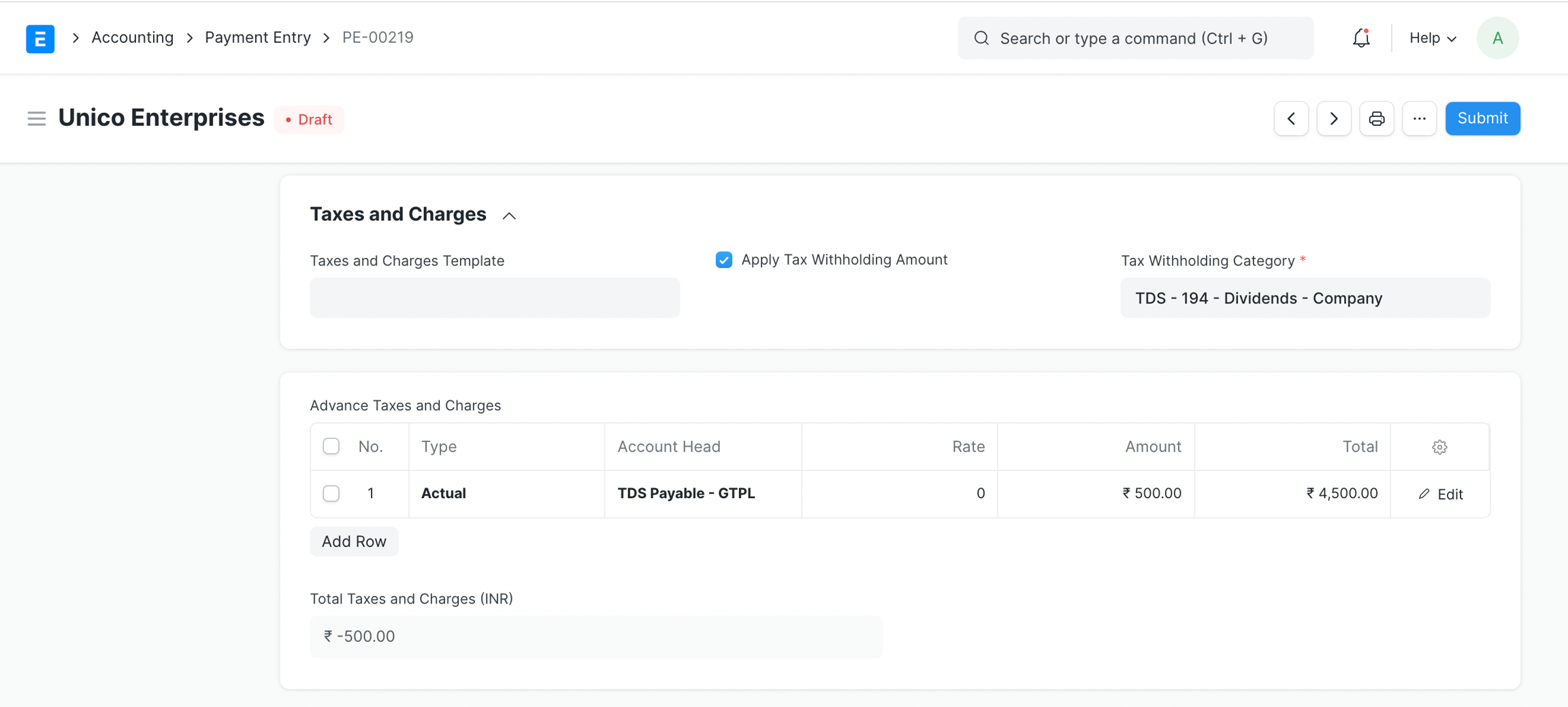 2. Tạo Mục nhập Thanh toán đối với Đơn đặt hàng đó, Trong phần Thuế và Phí, hãy bật "Áp dụng Khấu trừ thuế" và nhập các chi tiết khác, sau đó lưu và gửi mục nhập.