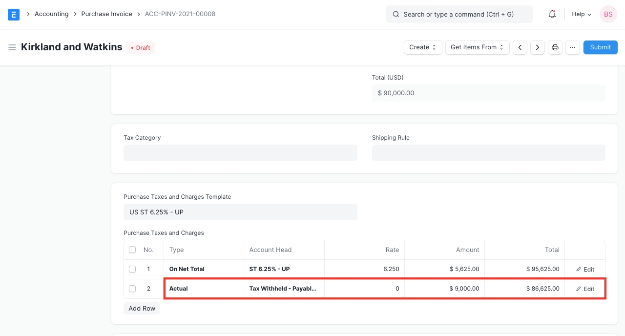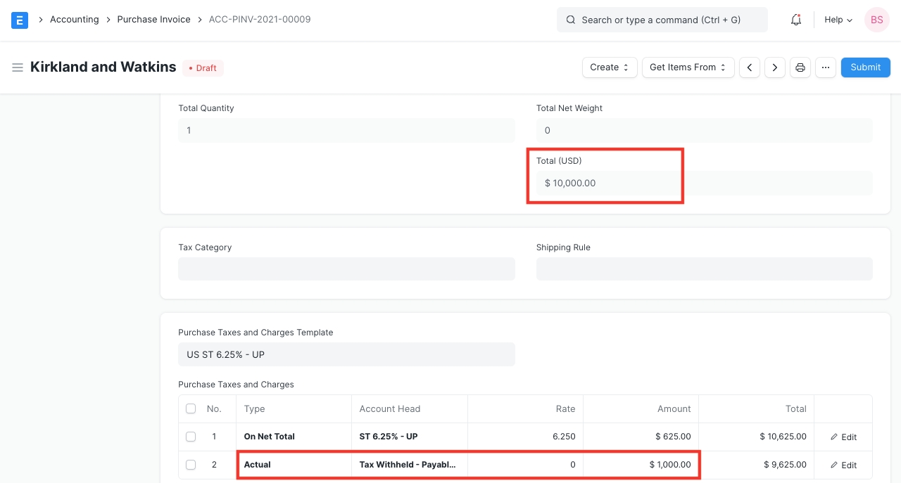 Hạng mục Khấu trừ thuế trong Hóa đơn Mua hàng Để xem ảnh hưởng của ngưỡng Tích lũy, hãy tạo hóa đơn với số tiền 10.000 và gửi hóa đơn đó.