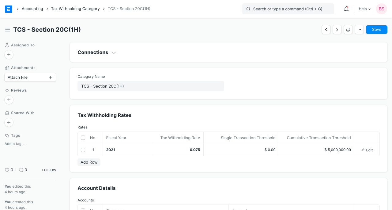 1. Trước tiên, chúng tôi sẽ tạo một Hạng mục Khấu trừ thuế có tên là TCS - Mục 20C (1H) và chúng tôi đặt ngưỡng tích lũy là 50 Lăk theo chương trình.