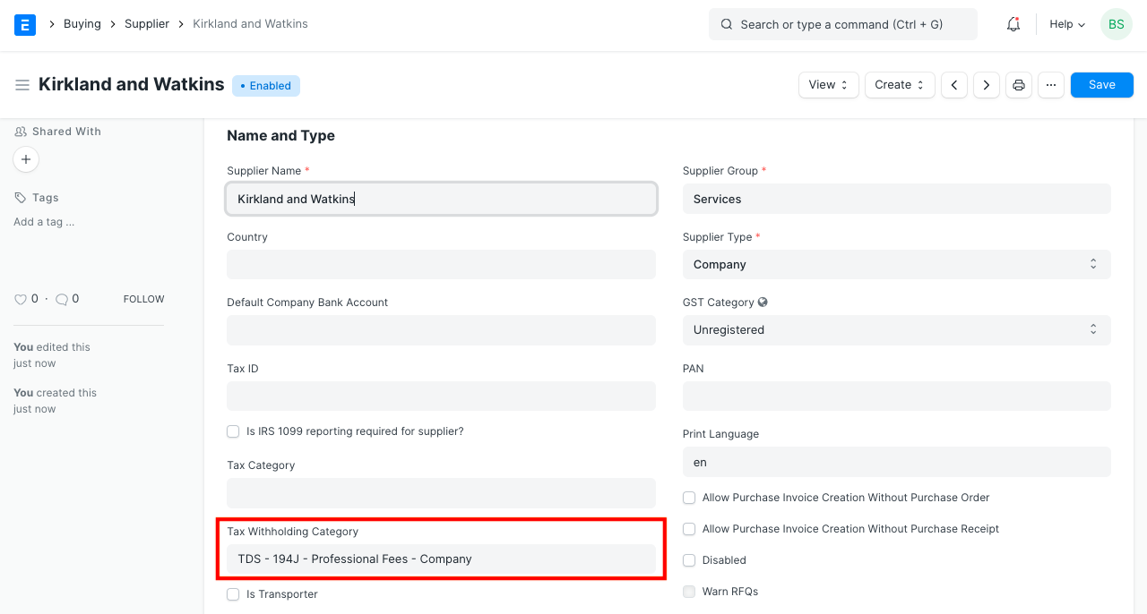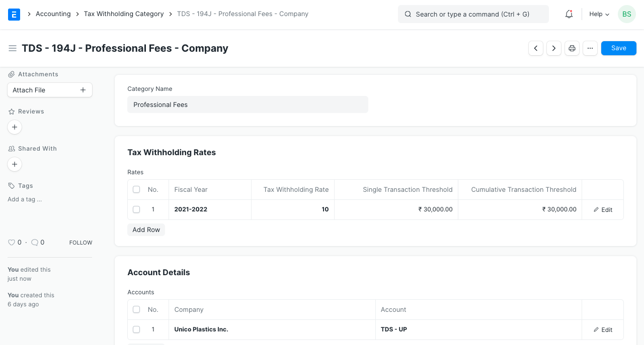 5. Nhấp vào Lưu. TDS sẽ được tự động áp dụng