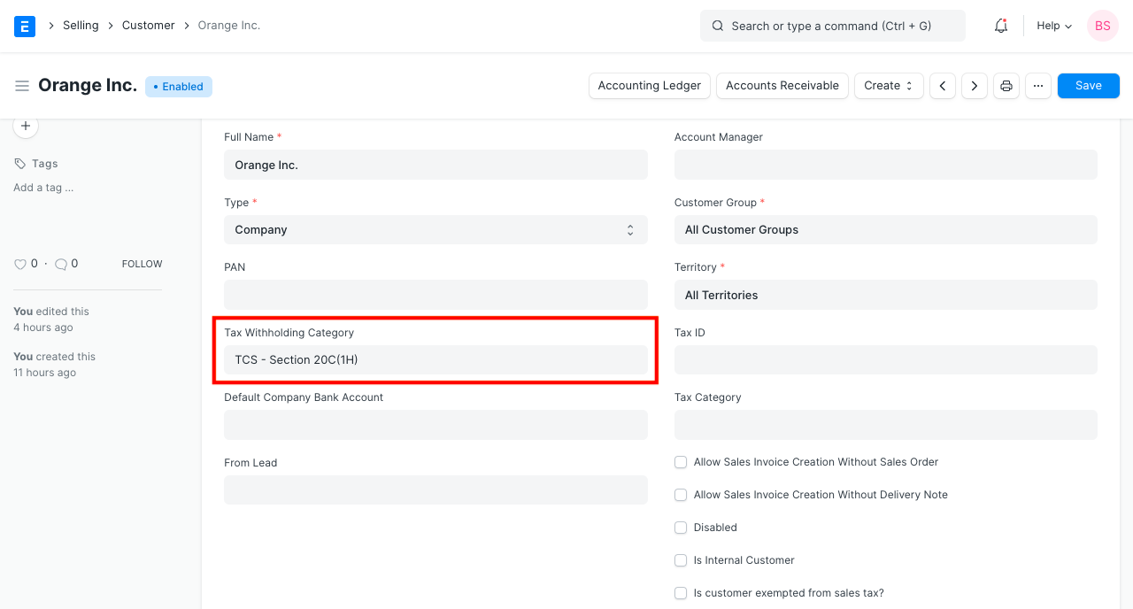 1. Nếu Khách hàng dự kiến ​​sẽ vượt qua ngưỡng bán hàng là 50 Lakh trong Năm tài chính hiện tại, thì chúng tôi có thể đặt Hạng mục Khấu trừ thuế của khách hàng thành TCS - Mục 20C (1H) để tự động tính TCS khi bán hàng dựa trên hóa đơn của khách hàng.