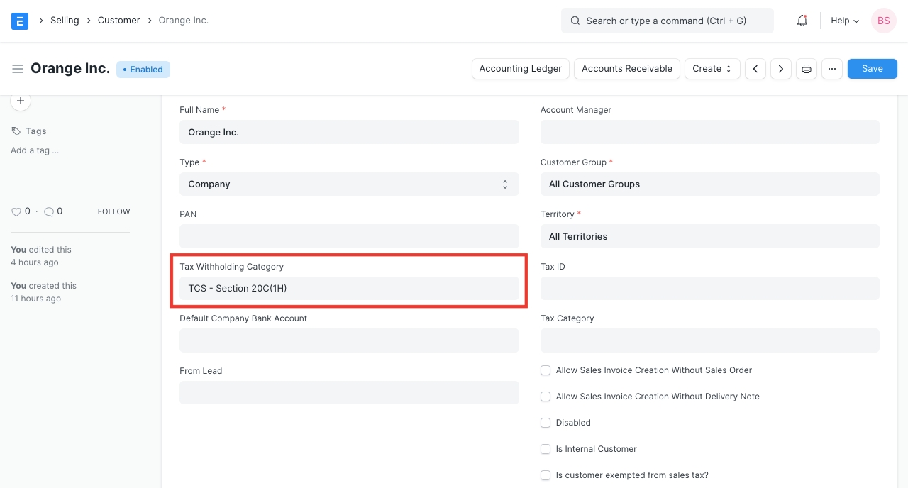 Nếu Khách hàng dự kiến sẽ vượt qua ngưỡng bán hàng là 50 Lakh trong Năm tài chính hiện tại, thì chúng tôi có thể đặt Hạng mục Khấu trừ thuế của khách hàng thành TCS - Mục 20C (1H) để tự động tính TCS khi bán hàng dựa trên hóa đơn của khách hàng.