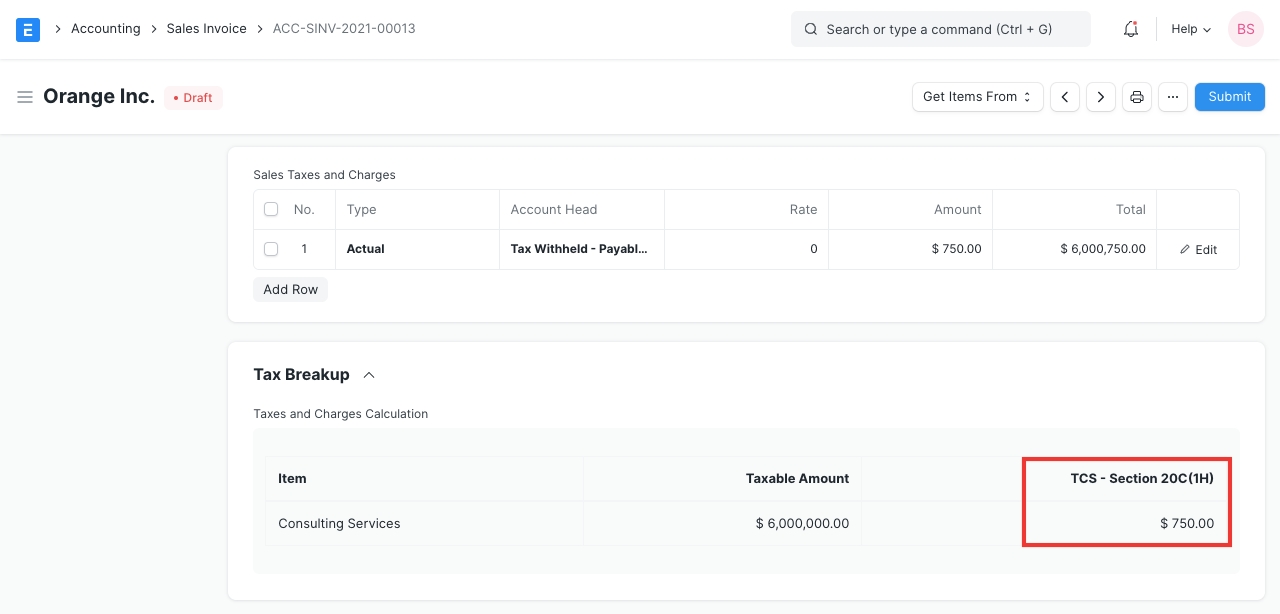 Tính toán TCS trong Hóa đơn bán hàng Vì hóa đơn vượt qua ngưỡng Tích lũy (50 Lăk), chúng tôi thấy rằng khoản thuế đó đã được tính. Do đó, thuế dựa trên thuế suất được cung cấp trong Danh mục khấu trừ thuế sẽ được áp dụng tương ứng. Lưu ý rằng, theo sơ đồ, TCS được tính trên số tiền vượt quá ngưỡng, tức là 0,075% của 10 Lakh.