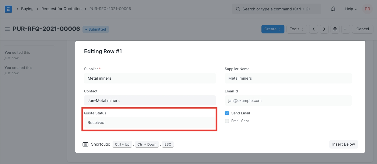 Khi gửi, ERPNext sẽ tạo Báo giá dành cho nhà cung cấp (chế độ dự thảo) đối với Nhà cung cấp. Người dùng phải xem lại Báo giá của Nhà cung cấp và gửi nó. Khi tất cả các hạng mục từ Yêu cầu báo giá đã được Nhà cung cấp báo giá, trạng thái báo giá được cập nhật thành 'Đã nhận' trong bảng 'Nhà cung cấp' của Yêu cầu báo giá.