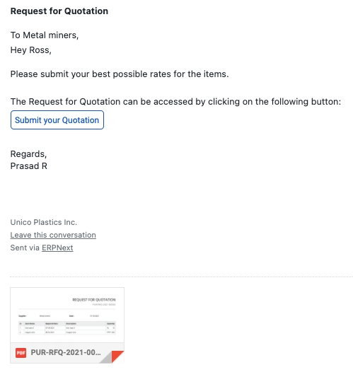 Yêu cầu Báo giá (RFQ) cũng có thể được tạo từ Yêu cầu Vật liệu đã gửi. Khi RFQ được tạo, bạn có thể in và gửi cho nhà cung cấp tệp PDF có tất cả các chi tiết bạn đã nhập có liên quan đến RFQ. Bạn cũng có thể nhận được câu trả lời của họ (Báo giá của nhà cung cấp) trong chính ERPNext, xem phần 4.1 Báo giá của nhà cung cấp theo người dùng . Tuy nhiên, đối với một số lượng lớn các mặt hàng, nhà cung cấp của bạn có thể thoải mái hơn với một trang tính Excel, v.v.