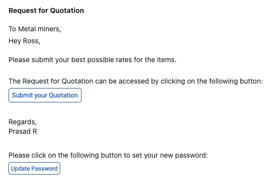 Nếu không có tài khoản của Nhà cung cấp : Hệ thống sẽ tạo tài khoản của Nhà cung cấp và gửi thông tin chi tiết đến Nhà cung cấp. Nhà cung cấp sẽ cần nhấp vào liên kết (Cập nhật mật khẩu) có trong email. Sau khi cập nhật mật khẩu, Nhà cung cấp có thể truy cập cổng thông tin của họ bằng biểu mẫu 'Yêu cầu Báo giá'. Nhà cung cấp sẽ được tạo với tư cách là Người dùng trang web.