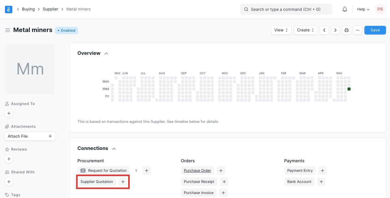 Bây giờ, khi Yêu cầu Báo giá được lưu, bạn có thể thấy trong Trang tổng quan rằng nó được liên kết với Yêu cầu Vật liệu. Nếu có nhiều Yêu cầu Nguyên liệu với các vật phẩm giống nhau, thì liên kết sẽ được tạo với Yêu cầu Nguyên liệu mới nhất.