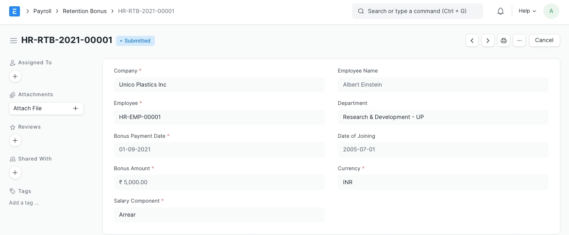 ERPNext cho phép bạn định cấu hình Tiền thưởng giữ chân cho một Nhân viên trong một khoảng thời gian cụ thể.