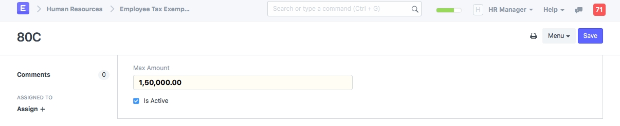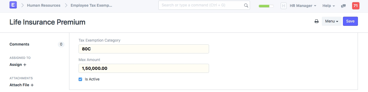 Việc miễn trừ tiền lương chịu thuế thường bị hạn chế đối với các khoản chi tiêu cho các hạng mục cụ thể do chính phủ hoặc các cơ quan quản lý quyết định. ERPNext cho phép bạn định cấu hình các danh mục khác nhau được phép miễn trừ. Ví dụ về điều này có thể là, đối với Ấn Độ, 80G, 80C, B0CC, v.v.