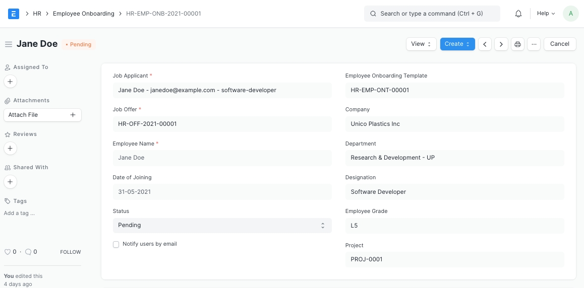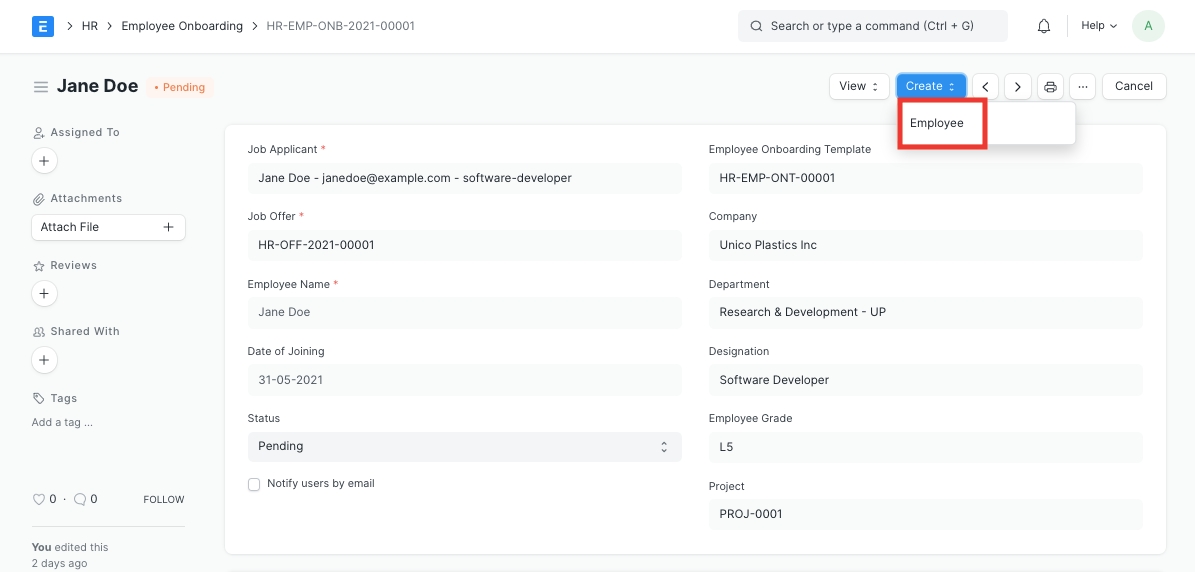 Bạn có thể trực tiếp tạo Nhân viên thông qua loại tài liệu Giới thiệu nhân viên (nếu chưa được tạo) sau khi tất cả các tác vụ giới thiệu bắt buộc hoàn tất.