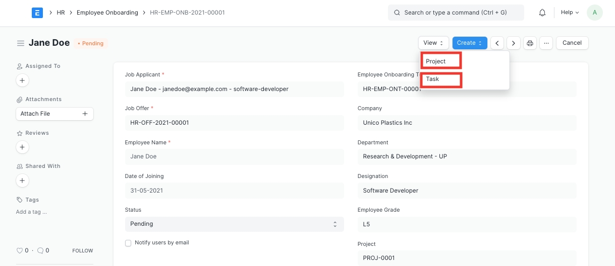 Khi nộp hồ sơ Giới thiệu nhân viên, một Dự án sẽ được tạo. Trong Dự án, Nhiệm vụ cũng sẽ được tạo cho mỗi Hoạt động. Nếu bạn đã đặt ngày và thời lượng cho các hoạt động, các nhiệm vụ sẽ được tạo với Ngày bắt đầu và Ngày kết thúc thích hợp, ngoại trừ ngày nghỉ.