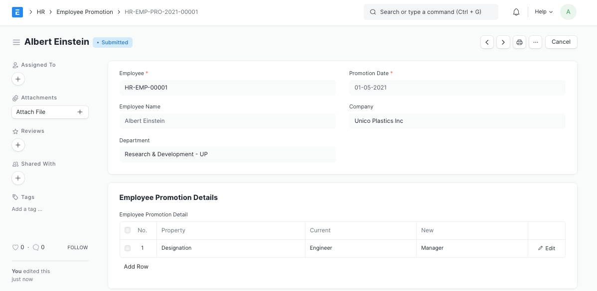 Lưu ý: Tài liệu khuyến mãi có thể được gửi vào hoặc sau Ngày khuyến mãi. Sau khi gửi, tất cả các thay đổi được thêm vào bảng Chi tiết khuyến mãi sẽ được áp dụng cho Nhân viên. ERPNext cũng giữ một bản ghi về tất cả các thăng chức của Nhân viên trong bảng Lịch sử việc làm trong tài liệu Nhân viên.