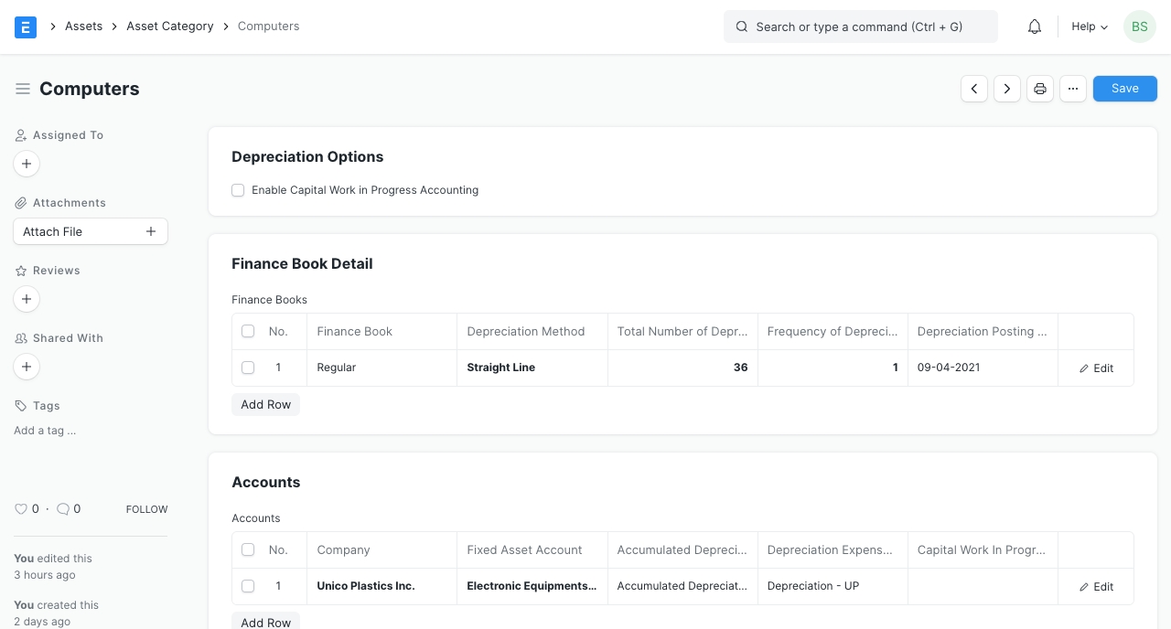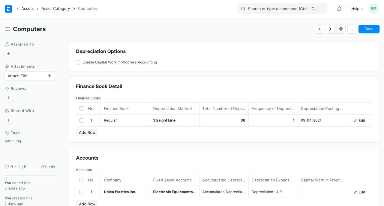 Lưu ý: Bạn cũng có thể đặt Trung tâm Chi phí và Tài khoản liên quan đến khấu hao mặc định trong Công ty chính.