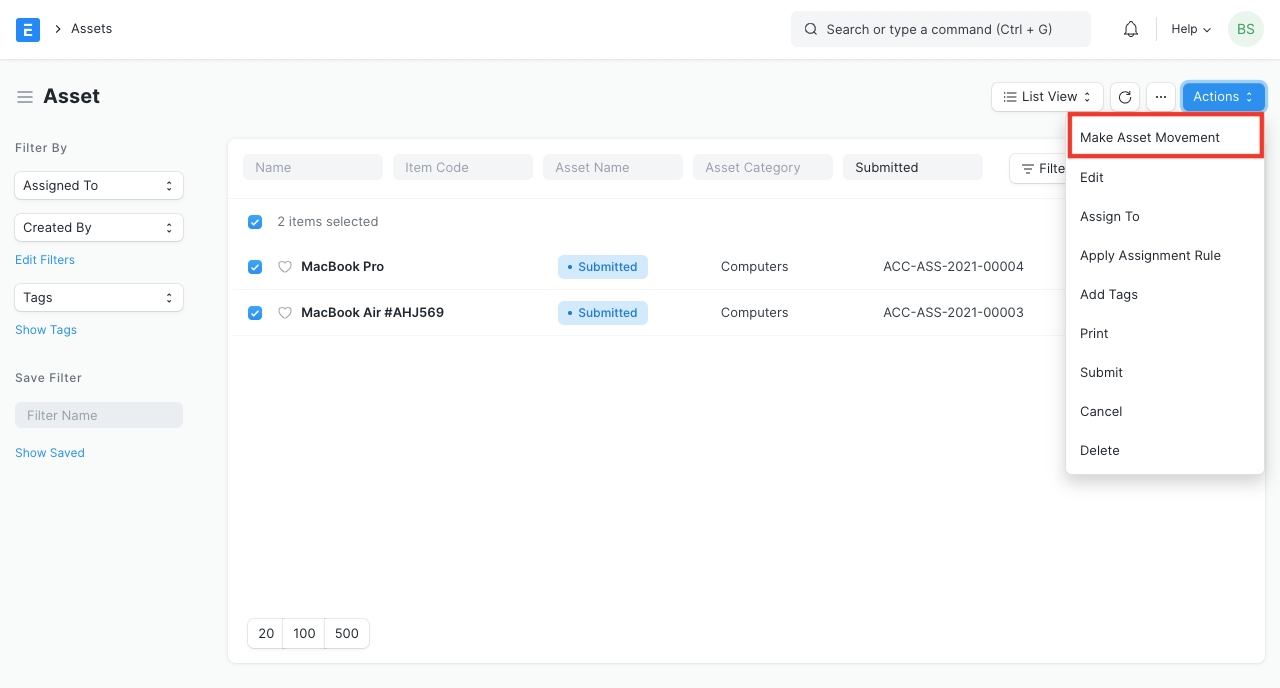 Để thực hiện Di chuyển tài sản của một số tài sản, bạn nên chuyển đến Danh sách tài sản, chọn tài sản cần di chuyển và nhấp vào Thực hiện di chuyển tài sản từ menu Hành động ở trên cùng bên trái.