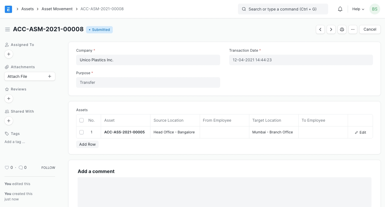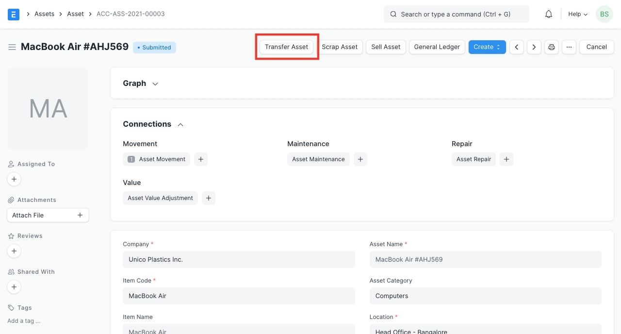 Ngoài ra còn có nút Chuyển tài sản ở trên cùng bên phải của biểu mẫu Tài sản để bắt đầu Chuyển tài sản. Nó tự động điền các trường có sẵn từ Biểu mẫu tài sản.