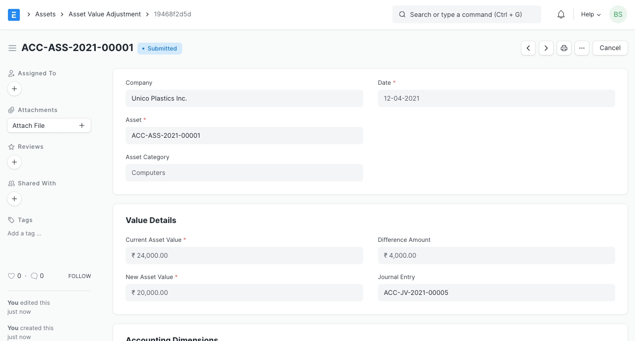 Trong trường hợp quản lý tài sản cố định, đôi khi giá trị của tài sản cần một số điều chỉnh. Ví dụ, nếu một máy tính xách tay bị hư hỏng vì một lý do nào đó, và giá trị của nó sẽ bị giảm ngay lập tức. Và trong trường hợp đó, chúng ta phải điều chỉnh lại giá trị của tài sản.